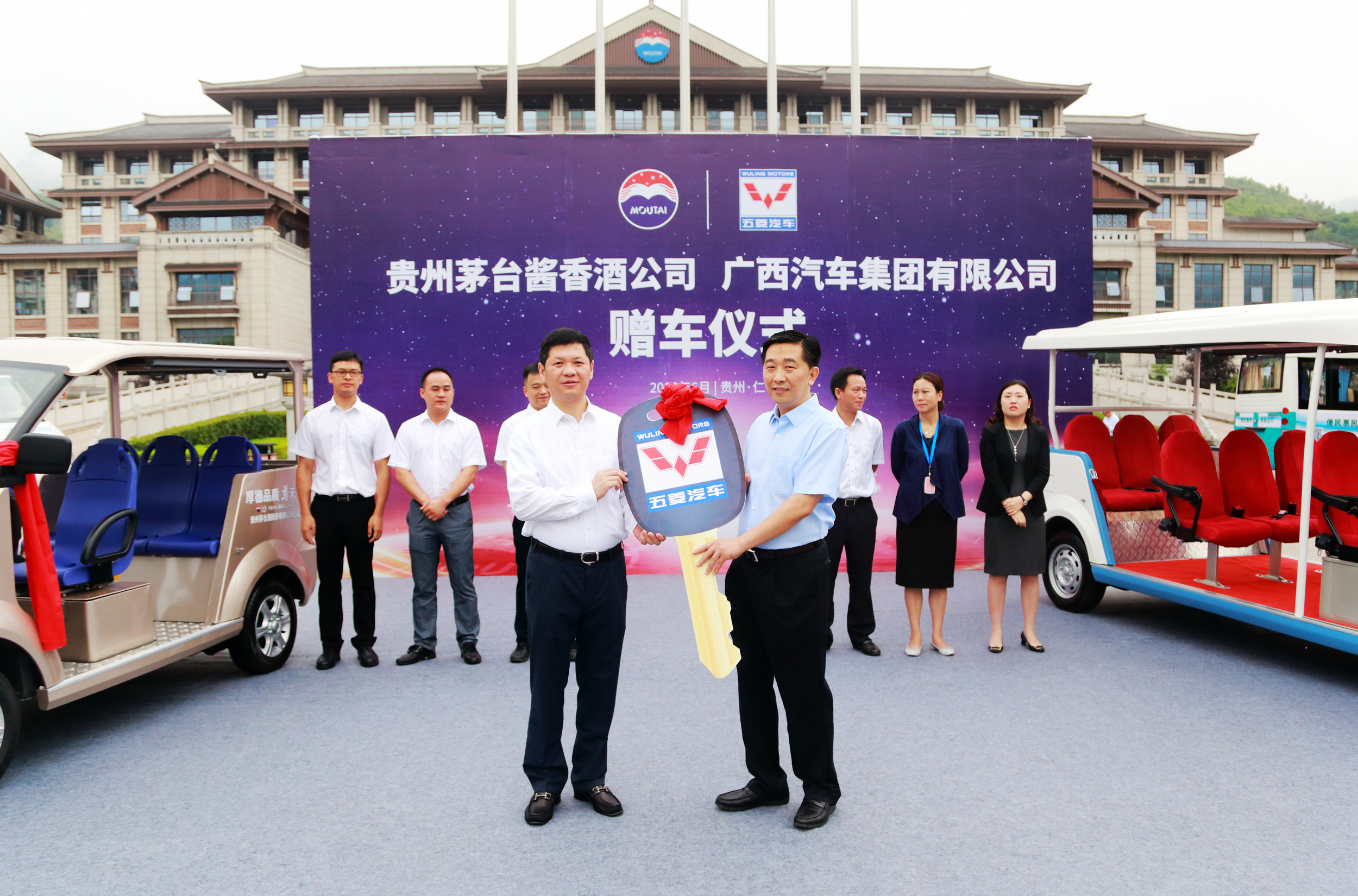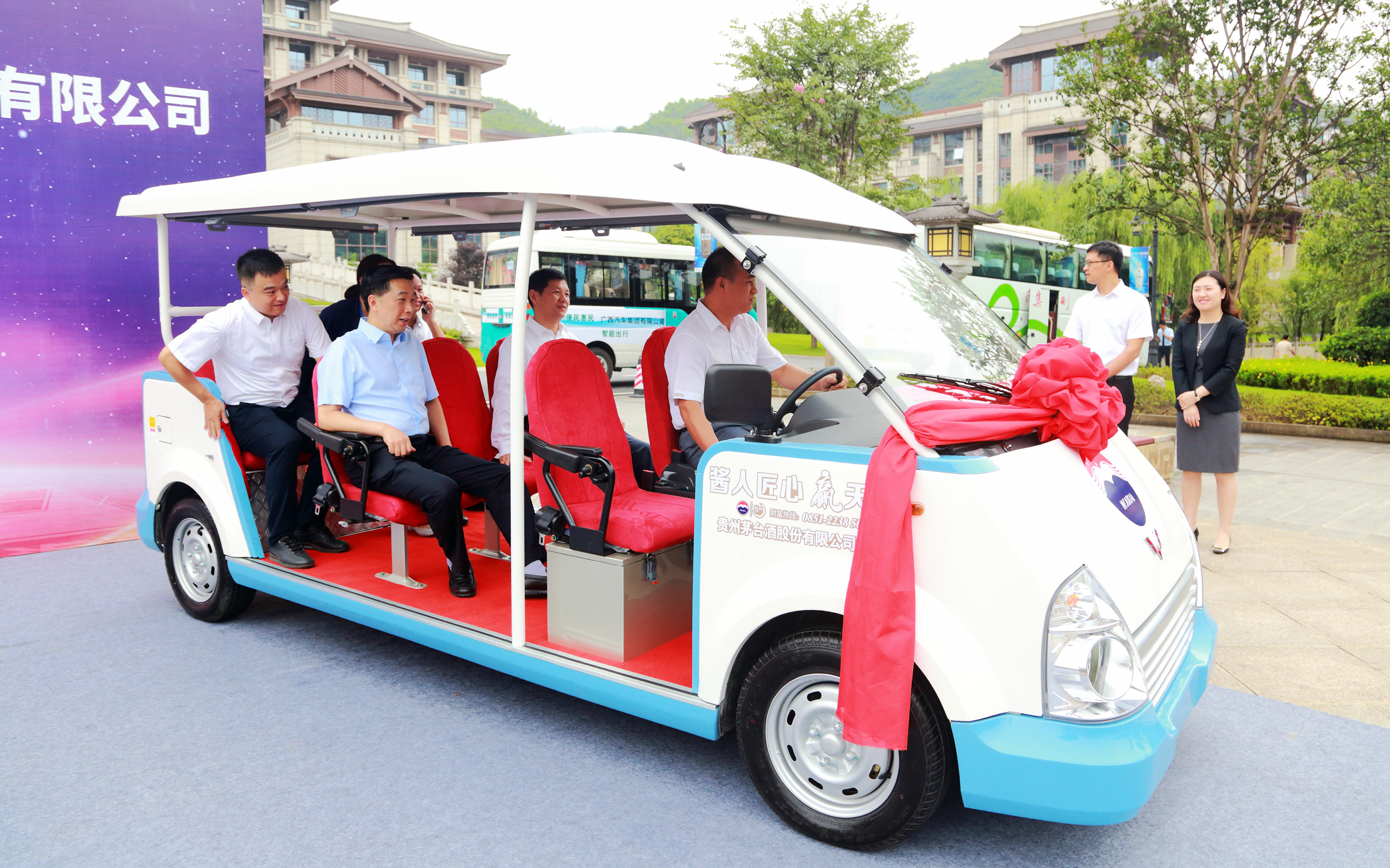 6月22日,廣西汽車集團將兩款觀光車正式贈予茅臺醬香酒公司(簡稱茅臺),交接儀式在遵義舉行。該觀光車為茅臺專屬全新定制,肩負(fù)兩個跨界行業(yè)領(lǐng)先品牌“神車+神酒”的重要合作意義。廣西汽車集團總裁、五菱工業(yè)公司總經(jīng)理袁智軍、廣西汽車集團副總裁、五菱工業(yè)公司副總經(jīng)理陳曉峰、貴州茅臺酒股份有限公司副總經(jīng)理、醬香酒公司董事長李明燦、醬香酒公司副總經(jīng)理張旭等出席儀式。