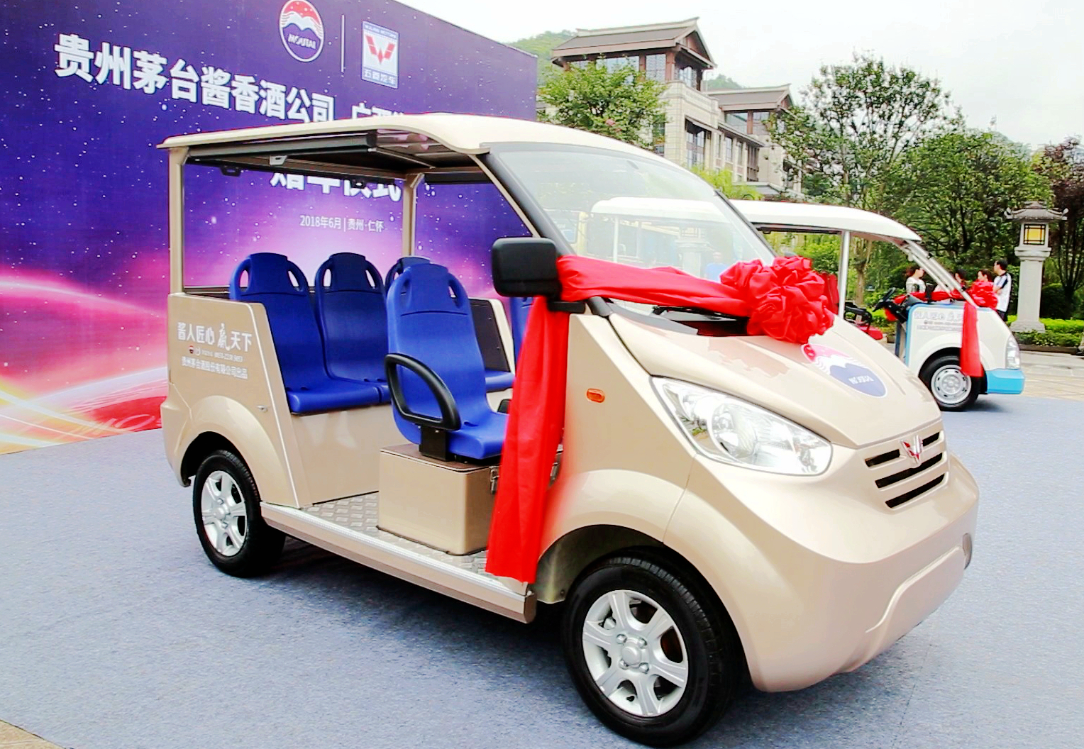 為進一步加深與茅臺醬香酒的合作,廣西汽車集團專屬定制2款經(jīng)典五菱觀光車贈送茅臺醬香酒公司,在其廠區(qū)內(nèi)使用。其中一款五菱威威觀光車,全國50%以上5A級景區(qū)在用,也是2017年“一帶一路”高峰論壇故宮接待國賓的唯一指定觀光用車。另一款為五菱電動觀光車,是一款可選裝鋰電池的新能源車,適用于景區(qū)觀光、社區(qū)公交、共享租賃等,此次更是結(jié)合了茅臺醬香酒的金色和企業(yè)LOGO特別定制。